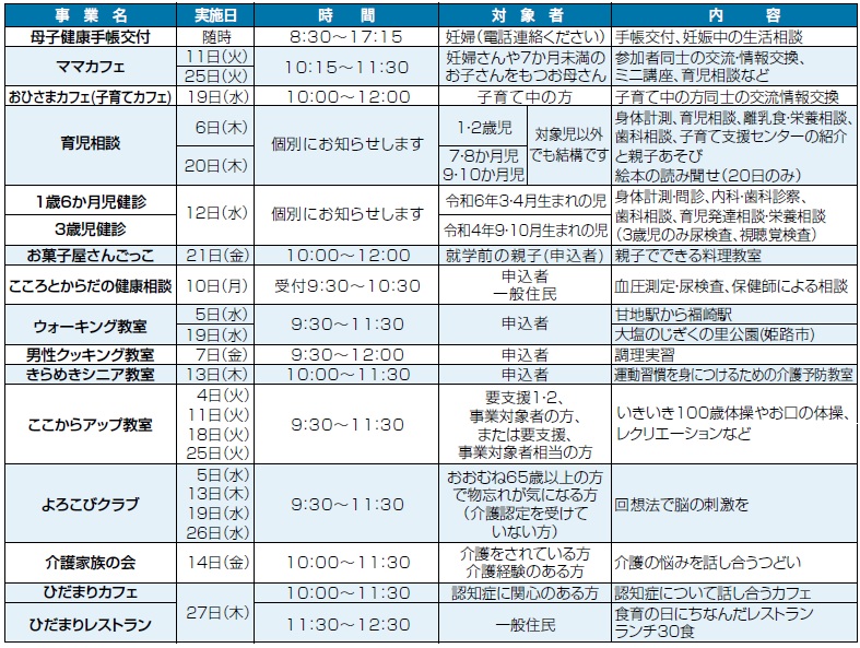問合せ:市川町保健福祉センター/市川町地域包括支援センター/親子すこやかセンター/子ども家庭センター