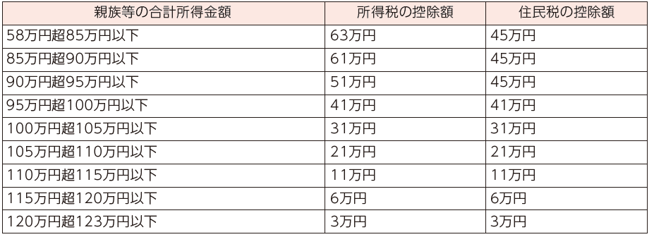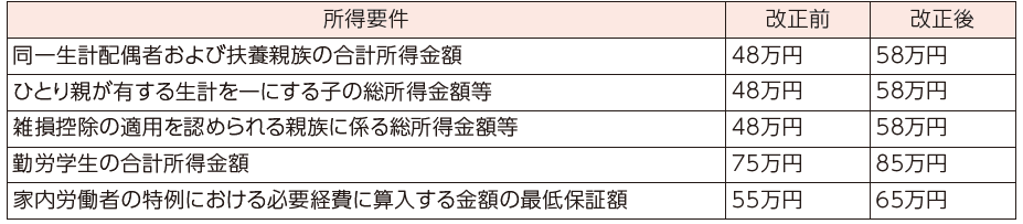 各種扶養控除等に係る合計所得金額の所得要件が以下のとおり10万円引き上げられます。