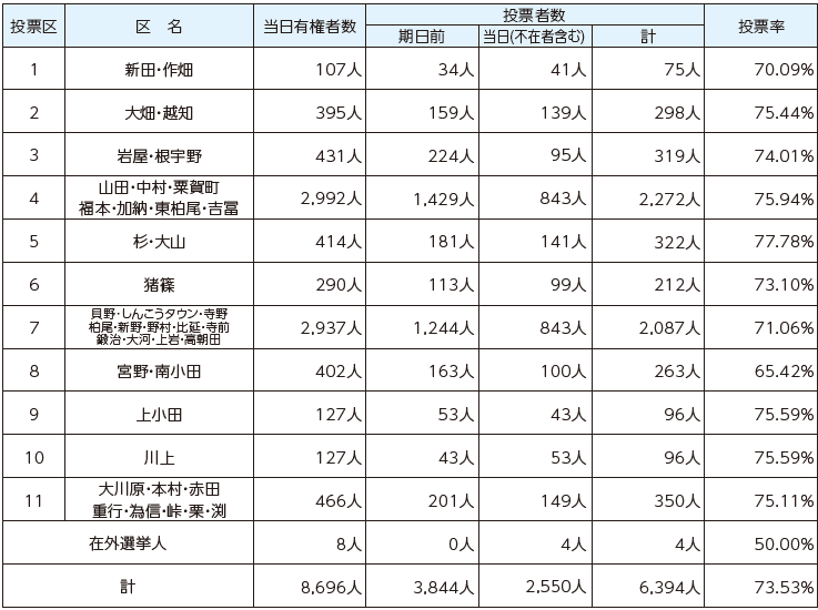 期日前投票と投票日当日を合わせた町全体の投票率(兵庫県選挙区)は73.53%と兵庫県下でトップの数値となり、町民の皆さまの政治に対する関心の高さを示す結果となりました。