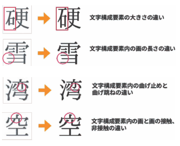 A.部首の大きさ、曲げはねの違い、一部の長さの違いなど、デザインの差(「字形」の違い)の範囲内で変わる場合があります。漢字の骨組み(「字体」の違い)は変わりません。