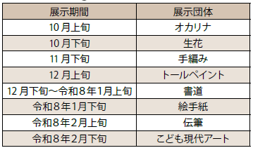 昨年度まで「4地区公民館合同学習発表会」を丸尾建築あすかホールで実施しておりましたが、今年度は大規模改修中のため、合同での学習発表会は開催せず、各地区公民館での館内展示会を開催します。