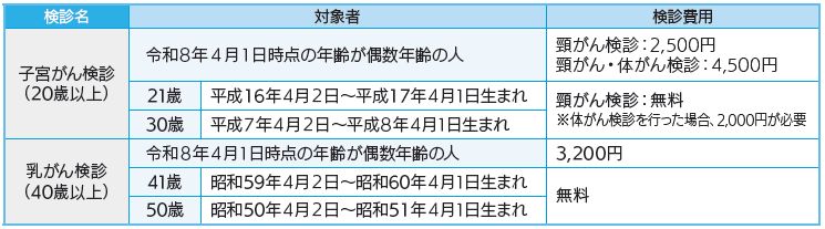 対象者には、5月に女性のがん検診費用助成券または無料検診クーポン券を送付しています。