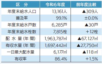 給水状況は、給水戸数6,285戸(前年度比30戸減)、年間配水量1,964千立方メートル(前年度比67千立方メートル減)、有収水量1,697千立方メートル(28千立方メートル減)になりました。有収率は、1.8%増の86.4%になりました。