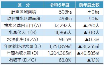 下水道事業全体では、年間総処理水量が1,751,859立方メートル(31,255立方メートルの減)、有収水量が1,204,385立方メートル(40,585立方メートルの減)、となりました。有収率は、1.1%減の68.8%になりました。