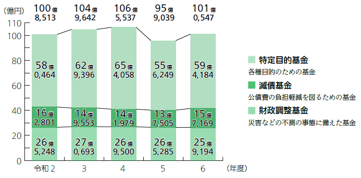 基金は、家庭でいう貯金です。歳入から歳出を引いた残りを積み立て、臨時の出費や財源不足時に取り崩して使います。令和6年度には、大型事業の起債償還など将来の財政需要を見据え、「減債基金」などに合計で約5億5,000万円を任意積立しました。