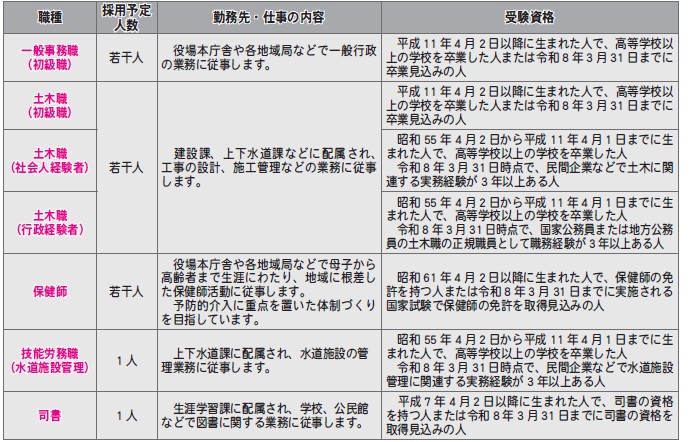 募集する職種は、一般事務職(初級職)、土木職(初級職、社会人経験者、行政経験者)、保健師、技能労務職(水道施設管理)および司書です。