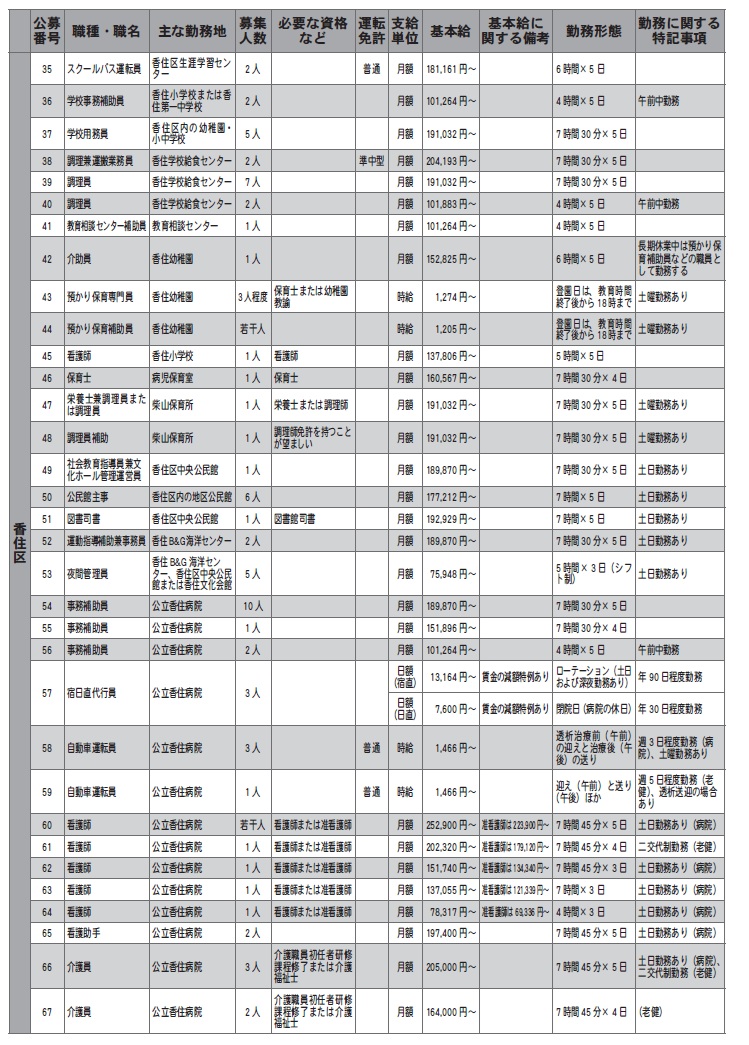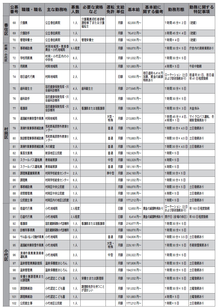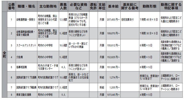 表の基本給は令和7年4月1日現在の条例などの額を基本に、勤務形態に基づいて記載しており、職に必要な経験年数などによって変動します。なお、基本給のほか、地域手当、通勤手当を別途支給し、週15時間30分勤務以上の職は、期末勤勉手当(月額給与×年4.6月[令和7年4月1日現在])を支給します。週20時間以上勤務の職は、市町村共済組合または公立学校共済組合および雇用保険などに加入します。