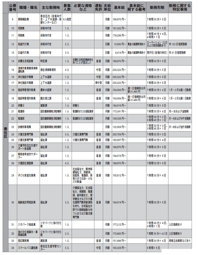 役場総務課および各地域局に備え付けの履歴書または市販の履歴書(いずれも写真貼付)と、希望職種の資格を持つ人はそれを証明する書類の写しを提出してください。応募は1人1職種に限りますので、「公募番号」と「希望職種」を履歴書の本人希望欄に明記してください。
