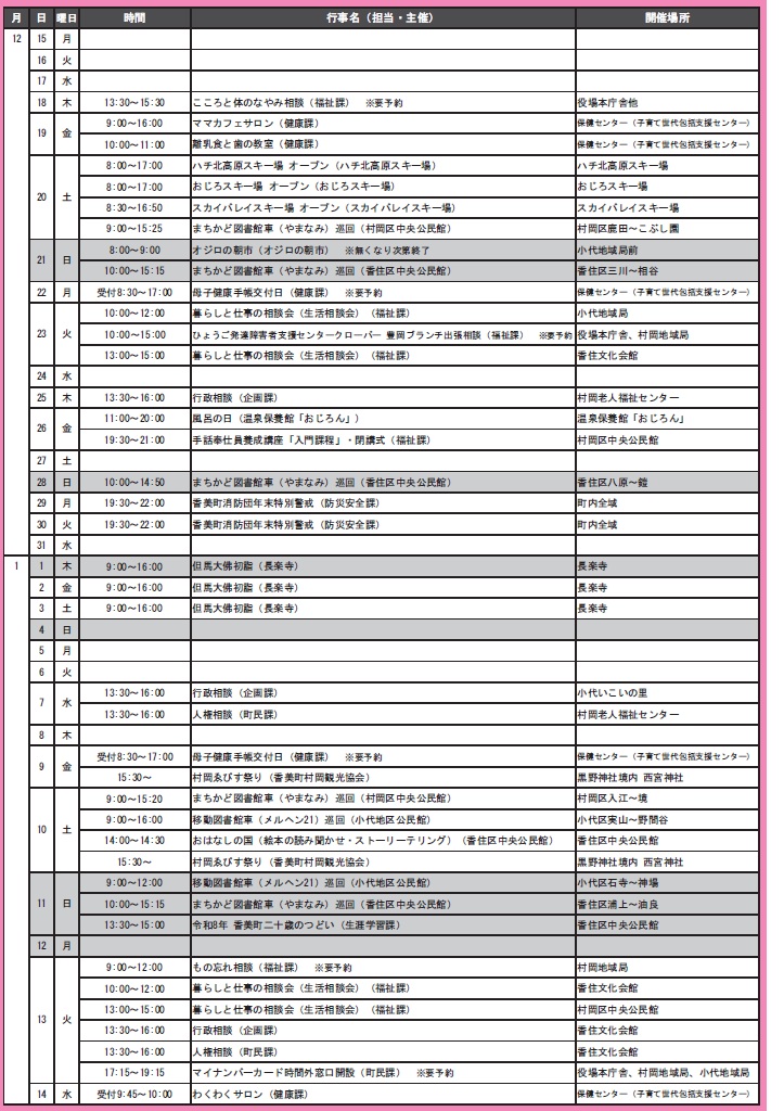 くらし いきいきカレンダー 12/15~1/14 26/40 前の記事 次の記事 発行日 : 2025年12月11日 自治体名 : 兵庫県香美町 広報紙名 : 広報「ふるさと香美」 第249号(令和7年12月号) ※下記の予定は変更となることがあります。 Tweet シェアする Photo News! まちの話題を Pickup 新規求人情報