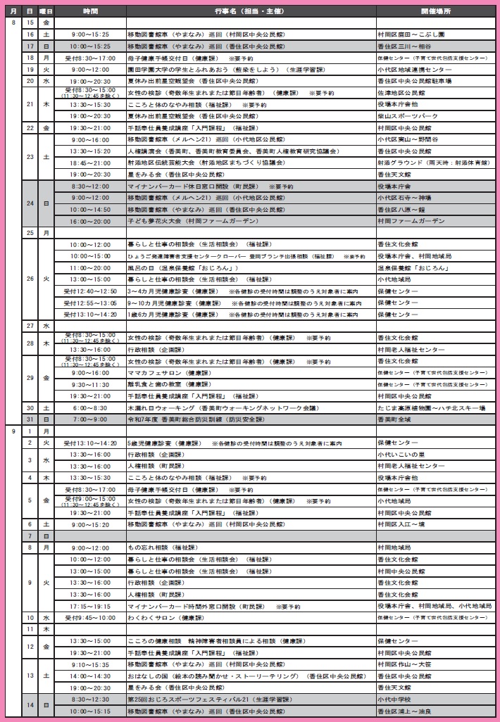くらし いきいきカレンダー 8/15~9/14 17/33 前の記事 次の記事 発行日 : 2025年08月12日 自治体名 : 兵庫県香美町 広報紙名 : 広報「ふるさと香美」 第245号(令和7年8月号) ※下記の予定は変更となることがあります。 Tweet シェアする まちの話題を Pickup ! Photo News! ありがとうございます 寄付をいただきました