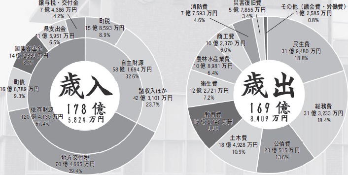 一般会計の歳出総額は169億8,409万円で、町民の皆さん一人当たりに置き換えると、およそ112万5,000円になります(令和5年度は98万9,000円)。