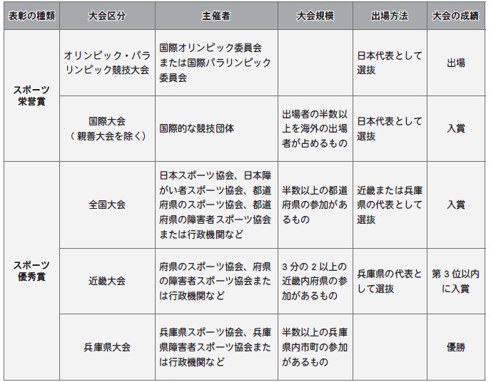 表彰の基準:次の表の大会に応じた成績を収めた人
