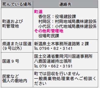 最近、道路や住宅の敷地内で死んでいる動物の死骸について問い合わせが増えています。本町では、動物の死骸の処理を次のとおりとしていますので、ご理解いただきますようお願いします。