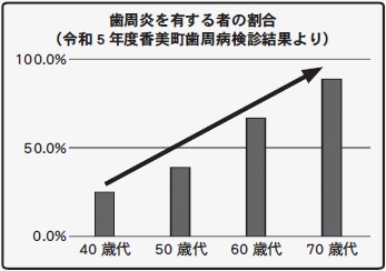特に歯を失う病気の第1位である歯周病は、年齢を重ねるごとに有病者率が増えていきます。また、発症については、30歳代後半が多いといわれているので、早い年代からのケアが必要です。