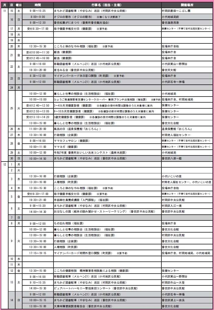 くらし いきいきカレンダー 11/15~12/14 18/34 前の記事 次の記事 発行日 : 2025年11月13日 自治体名 : 兵庫県香美町 広報紙名 : 広報「ふるさと香美」 第248号(令和7年11月号) ※下記の予定は変更となることがあります。 Tweet シェアする Photo News! まちの話題を Pickup ありがとうございます 寄贈をいただきました