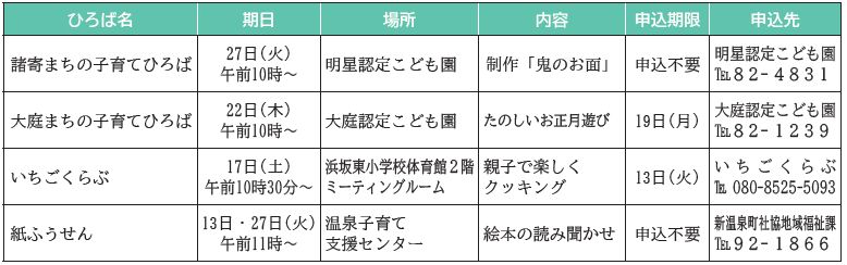 子育て まちの子育てひろば(1月) 30/41 前の記事 次の記事 発行日 : 2026年01月01日 自治体名 : 兵庫県新温泉町 広報紙名 : 広報しんおんせん 令和8年1月号 vol.244 Tweet シェアする 子育てランド(1月) 町の広報媒体をご活用ください