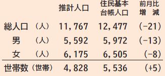 その他 まちのうごき 1月1日現在 36/38 前の記事 次の記事 発行日 : 2026年01月22日 自治体名 : 兵庫県新温泉町 広報紙名 : 広報しんおんせん 令和8年2月号 vol.245 ■推計人口 直近の国勢調査の人口を基礎に、住民基本台帳の移動数を加減し、町内に居住していると推計される人口 ■住民基本台帳人口 住民基本台帳に届出により記録されている町民の数 Tweet シェアする 固定資産税第4期 納期限3月2日(月) すけっちしんおんせん~まちの話題~