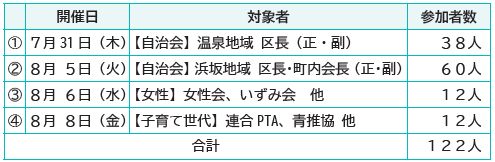※会場は、(1)・(4)は町民センター(2階集会室)、(2)・(3)は浜坂多目的集会施設(2階多目的ホール)。