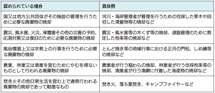 ・例外であってもむやみに焼却してよいというわけではなく、生活環境への著しい支障を生じる焼却はこれに含まれません。近隣住民から苦情が出ないよう、風が強い日、乾燥した日、場所、時間帯及び量を考慮し、火災にならないよう対策をとりましょう。