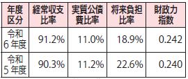 経常収支比率は、91・2%で前年度に比べ0・9%増加しました。また、実質公債費比率(過去3か年平均)と将来負担比率は、それぞれ11・0%(前年度比0・2%減少)、18・9%(前年度比3・7%減少)となりました。
