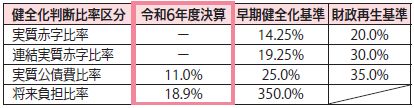 令和6年度決算では、すべての指標で国が定める基準を下回り、町の財政・すべての公営企業会計で健全性を確保できています。