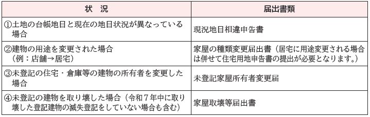 固定資産税(土地、建物)は、毎年1月1日基準日の所有者に対し、現在の状況に応じて課税(現況課税)されますが、未登記物件及び用途変更に関しては現況把握が困難な場合があります。そのため、令和7年1月1日~12月31日の期間に、次の表内の(1)~(4)に該当する場合は届出書類を提出していただく必要があります。なお、届出がない場合、現況と異なった地目として土地が課税されたり、所有していない建物に課税される場合があります。