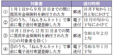 日本年金機構から次のスケジュールで「社会保険料(国民年金保険料)控除証明書」を対象者宛に送付します。
