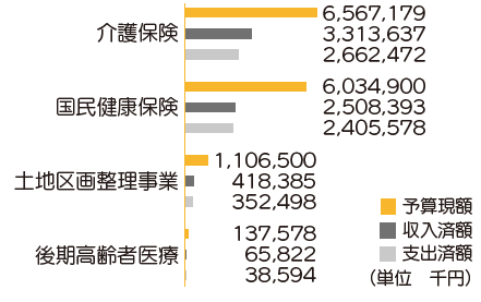 一般会計では、当初予算284億7,000万円に前年度からの繰越予算と補正予算を加えた294億882万1千円が現在の予算額となります。一方、特別会計では各会計の総額で当初予算137億1,300万円に繰越予算と補正予算を加えた138億4,615万7千円が現在の予算額となります。各会計の執行状況などは以下のとおりです。