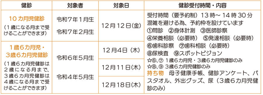1歳6カ月児健診と3歳6カ月児健診は同日開催での集団健診です。