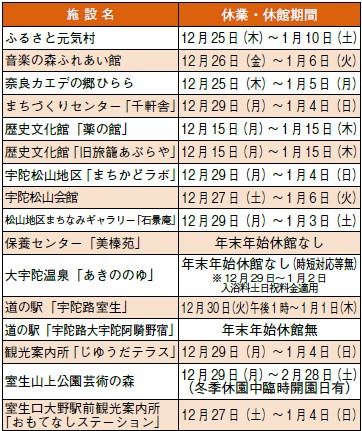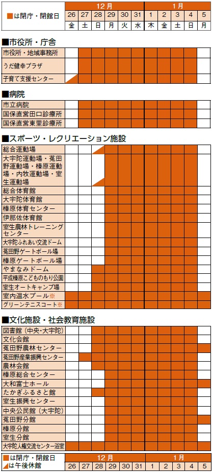 ※総合体育館、総合運動場、グリーンテニスコート、各公民館は12月29日(月)からの停止となります