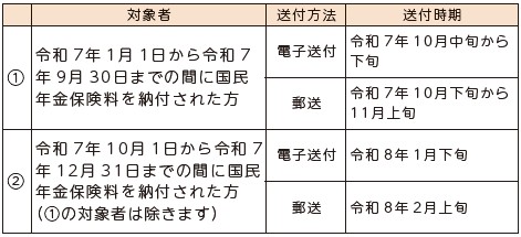 このため、日本年金機構から下記のスケジュールで「社会保険料(国民年金保険料)控除証明書」が対象者宛てに送られますので、お手元に届きましたら、大事に保管し、年末調整や確定申告の際に使用してください。