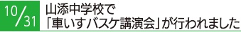 車いすバスケットボールチーム「伊丹スーパーフェニックス」の川上さん、「三重チャリオッツ」の田中さんをお招きして、車いすでの日常の生活について講演いただきました。「バスケットを通して、出会えた人とのつながりに感謝しながら、いろいろなことに挑戦し続けるお二人の姿に感銘を受けました。」などの感想がありました。また講演後の体験では、リレーや試合を行い、車いすの操作に四苦八苦しながらも、充実した交流となりました。