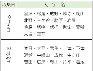 10月のリサイクル物品回収日は次のとおりです。通常第2週目の日曜日に回収を行っている大字について、第4週目の日曜日に変更しています。ご注意ください。