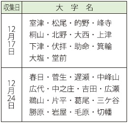 12月のリサイクル物品回収日は次のとおりです。ごみの中にも資源となるものが混じっているかもしれませんので今一度確認の上、ごみの減量化、資源化にご協力ください。