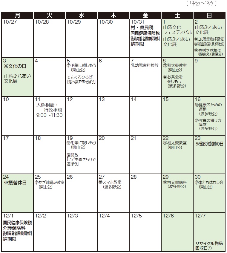 村主催の催しなどを1カ月分のカレンダーにまとめました。