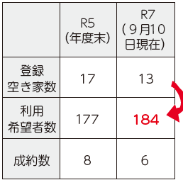 現在、空き家の成約数が増え、空き家バンクに登録の空き家が足りていません。近隣で空き家がある、空き家の管理に困っている方は、ぜひ情報をご提供ください。