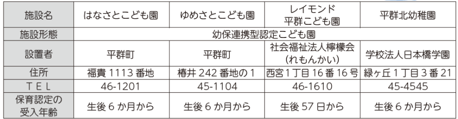 保育認定:令和2年4月2日生まれから令和7年10月1日(レイモンド平群こども園は令和7年11月4日)までに出生した保育を必要とする子ども