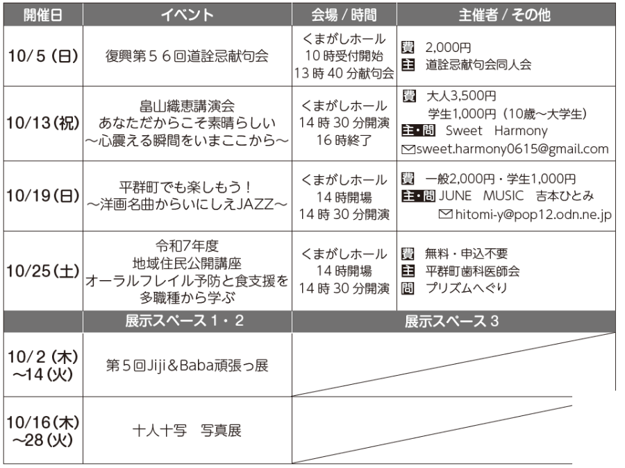 イベント 総合文化センター【10月】イベント情報 24/44 前の記事 次の記事 発行日 : 2025年10月01日 自治体名 : 奈良県平群町 広報紙名 : MY TOWN 平群 令和7年10月号 Tweet シェアする 手話で話そう! コンビニで住民票等が取得できます