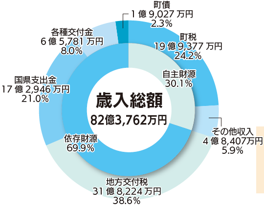 本町は財源の約7割を国や県からの交付税等に依存する決算となっています。