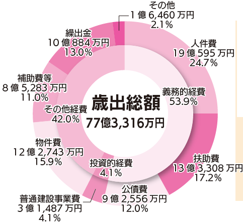 義務的経費の割合が半分以上を占めており、財政健全化への大きな課題となっています。