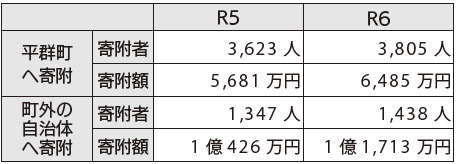 ふるさと納税寄附額は6,485万円(前年度比+804万円)と昨年度に引き続き、過去最高額を更新しています。一方、町民の方の町外の自治体への寄附額も昨年度より増加しており、令和6年度も平群町への寄付額よりも町外への寄附額のほうが5,228万円上回っています(下記表参照)。