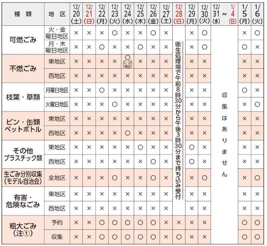 ・年末年始の各地区の収集日は、例年排出量が多く、通常の収集時間より遅れる場合があります。また、12月29日(月)と30日(火)は全町域での収集となり、通常の収集ルートや収集時間が異なる場合がありますので、必ず午前8時までに出してください。