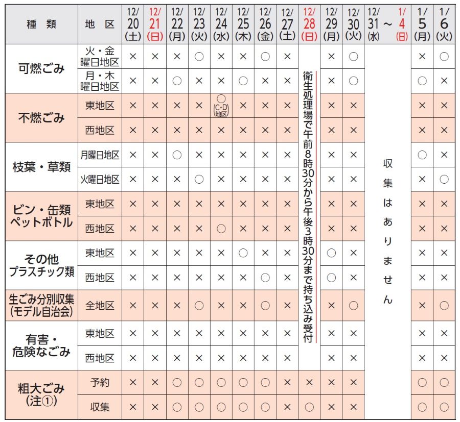・12月29日(月)は、全町域で「その他プラスチック類」の収集を実施し、12月30日(火)は全町域で「可燃ごみ」と「生ごみ分別収集(モデル自治会)」の収集を実施します。(戸別収集先行地域は、「可燃ごみ」と「生ごみ」の戸別収集を含みます)