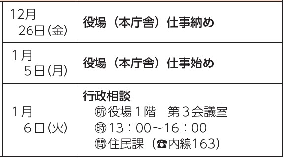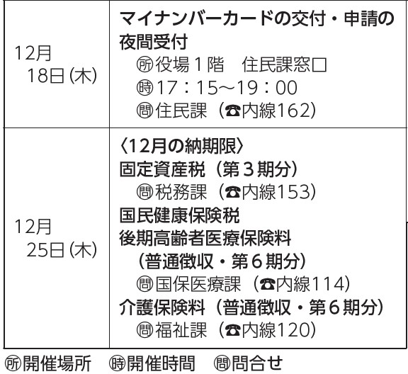 くらし 行事予定 14/15 前の記事 次の記事 発行日 : 2025年12月15日 自治体名 : 奈良県斑鳩町 広報紙名 : 広報斑鳩 お知らせ版 令和7年12月15日号 ※掲載している行事は、申し込み不要のものです。行事は変更される場合がありますのでご了承ください。 Tweet シェアする 取り壊した家屋(建物)はありませんか その他のお知らせ(広報斑鳩 お知らせ版 令和7年12月15日号)