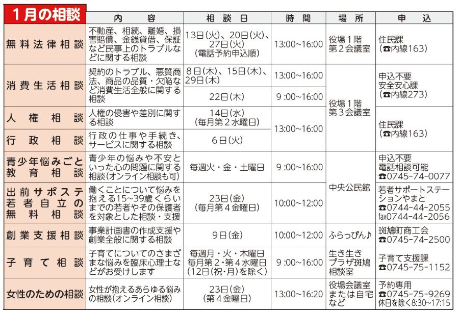 くらし 1月の相談 18/28 前の記事 次の記事 発行日 : 2026年01月01日 自治体名 : 奈良県斑鳩町 広報紙名 : 広報斑鳩 2026年1月号 ※相談の時間が9:00~16:00の場合は、12:00~13:00の間は不在となります。 Tweet シェアする 役場税務課からのお知らせ 奈良税務署からのお知らせ