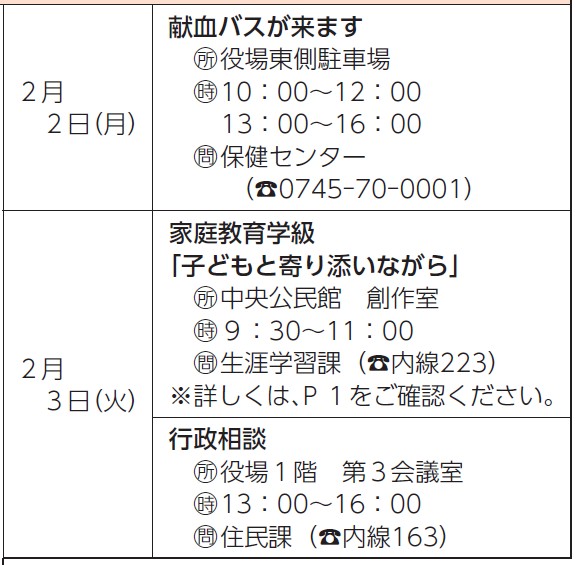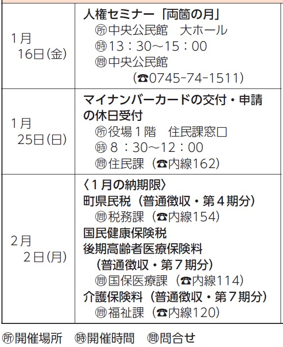 くらし 行事予定 18/19 前の記事 次の記事 発行日 : 2026年01月15日 自治体名 : 奈良県斑鳩町 広報紙名 : 広報斑鳩 お知らせ版 令和8年1月15日号 ※掲載している行事は、申し込み不要のものです。行事は変更される場合がありますのでご了承ください。 Tweet シェアする 令和7年度 絵で伝えよう!「わたしの町のたからもの」絵画展 その他のお知らせ(広報斑鳩 お知らせ版 令和8年1月15日号)