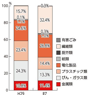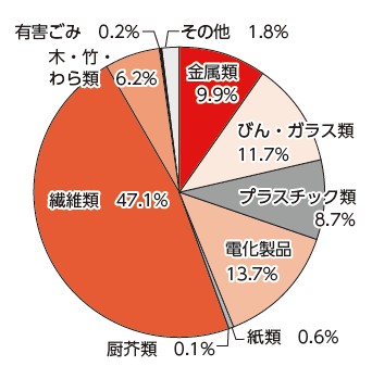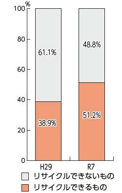 ごみ質検査の結果、51.2%が分別により資源化できるもので、前回の平成29年度の38.9%より12.3ポイント増加していました。そのうち、32.4%は古着などの繊維類、ほかには電化製品や、プラスチック製のハンガーやバケツ、おもちゃ、お菓子の袋などのプラスチック類が多く含まれていました。