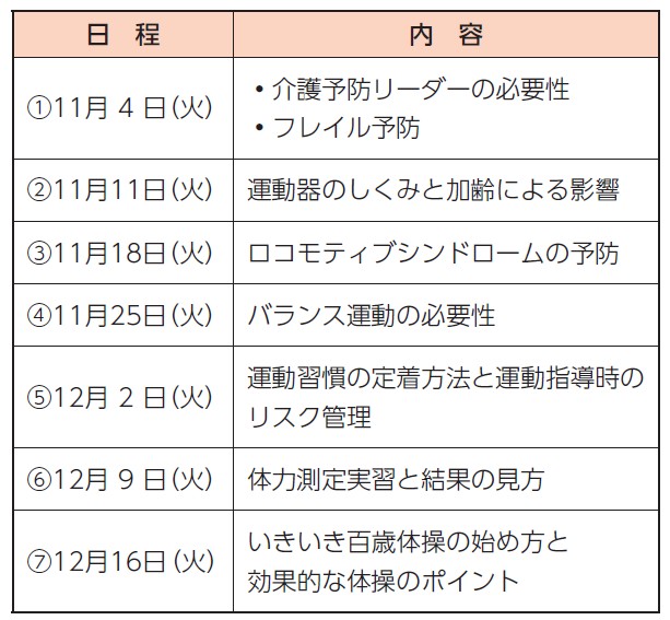 近年、住民が主体となった介護予防の活動が注目されています。この講座では、介護予防に必要な知識や方法を学び、地域の高齢者に広めていくリーダーとして活躍していただくことをめざします。介護予防を広めて一緒に元気な地域をつくりましょう。