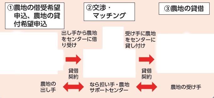 なら担い手・農地サポートセンターは、農地の出し手(貸したい人)から農地を借り受け、受け手(借りたい人)へマッチングします。