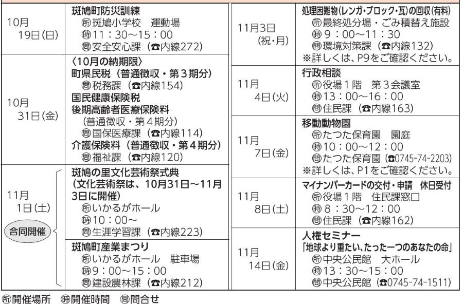 くらし 行事予定 17/18 前の記事 次の記事 発行日 : 2025年10月15日 自治体名 : 奈良県斑鳩町 広報紙名 : 広報斑鳩 お知らせ版 令和7年10月15日号 ※掲載している行事は、申し込み不要のものです。行事は変更される場合がありますのでご了承ください。 Tweet シェアする 農地を貸したい人、借りたい人を募集!! その他のお知らせ(広報斑鳩 お知らせ版 令和7年10月15日号)